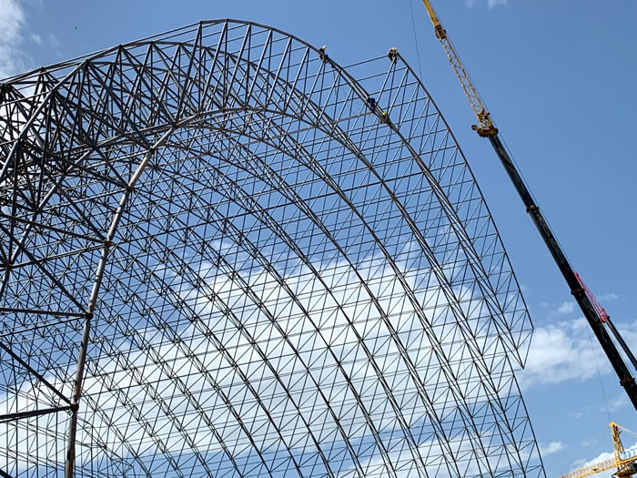 (2)网架加工前应对现场尺寸进行复测,确认无误后方可进行加工、安装;网架制作、运输、安装应遵守《空间网格结构技术规程》JGJ7-2010、《钢网架新密螺栓球节点》JG/T 10-2009、《钢网架新密螺栓球节点用高强度螺栓》 GB/T 16939-2016、《新密钢结构新密工程新密施工规范》 GB50755-2012、《新密钢结构新密工程新密施工质量验收标准》 GB50205-2020。